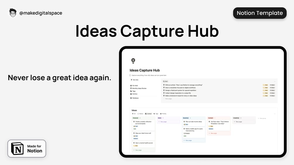 Ideas Capture Hub is a simple, powerful Notion template designed to help you capture, organize, and revisit your best ideas — whether they pop into your head during a walk, a meeting, or at 2 AM.